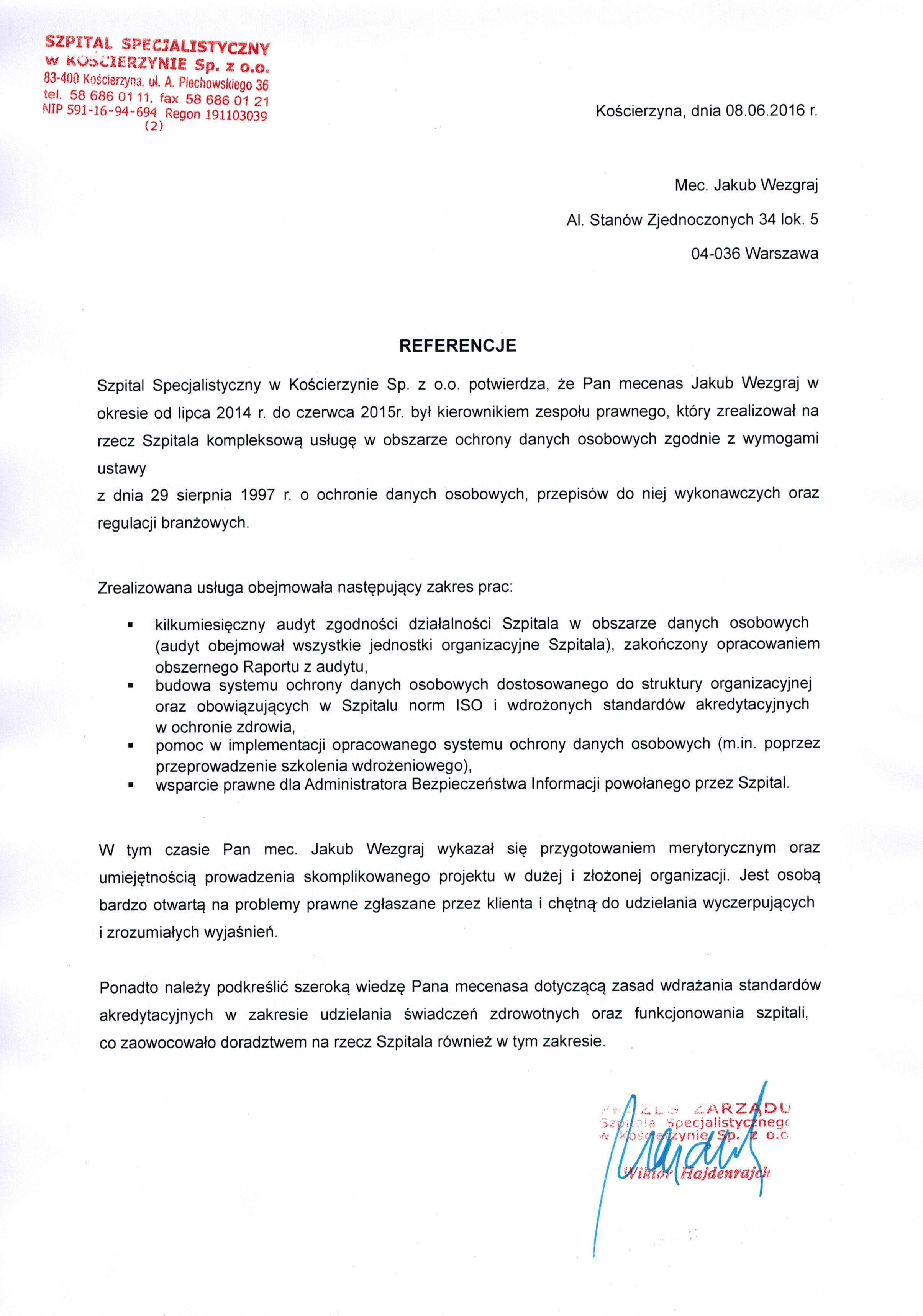 Ponadto należy podkreślić szeroką wiedzę Pana mecenasa dotyczącą zasad wdrażania standardów akredytacyjnych w zakresie udzielania świadczeń zdrowotnych oraz funkcjonowania szpitali, co zaowocowało doradztwem na rzecz Szpitala również w tym zakresie.